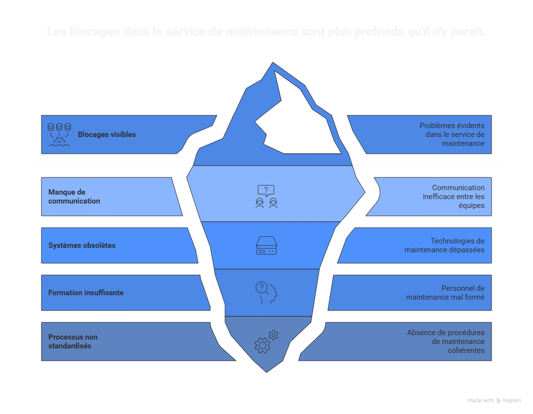 Les blocages dans le service de maintenance peuvent être variés et souvent interconnectés. Voici quelques-uns des plus courants :